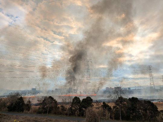 2026年2月15日の10時頃に会社近くの淀川に行くと、ヨシ原焼きが実施されていました。
